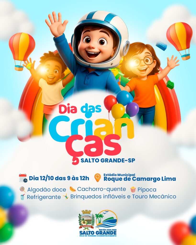 A Prefeitura Municipal de Salto Grande vai realizar uma grande Festa das Crianças no próximo sábado, 12 de outubro, em comemoração ao Dia das Crianças. O evento acontecerá das 9h às 12h no Estádio Municipal Roque de Camargo Lima, com uma programação especialmente pensada para garantir muita diversão para a garotada e a família.