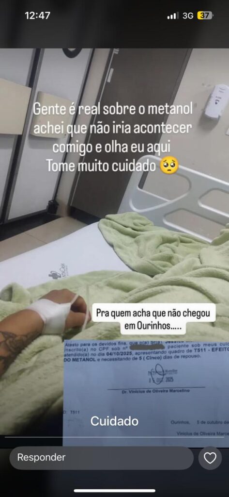 Uma postagem feita nas redes sociais nesta segunda-feira (6) causou preocupação em Ourinhos ao relatar um caso de suposta intoxicação por metanol. Na imagem, a pessoa aparece internada em um leito hospitalar e exibe um atestado médico, afirmando ter sofrido os efeitos da substância. A publicação viralizou rapidamente, gerando comentários e especulações entre os moradores.