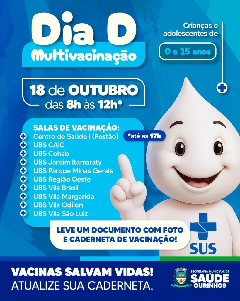 Esta mobilização faz parte da Campanha Nacional de Multivacinação que acontece em todo o país durante o mês de outubro, com o Dia D concentrando esforços para agilizar a vacinação no público-alvo. Aproveite essa oportunidade para cuidar da saúde e proteger as crianças e adolescentes de Ourinhos.