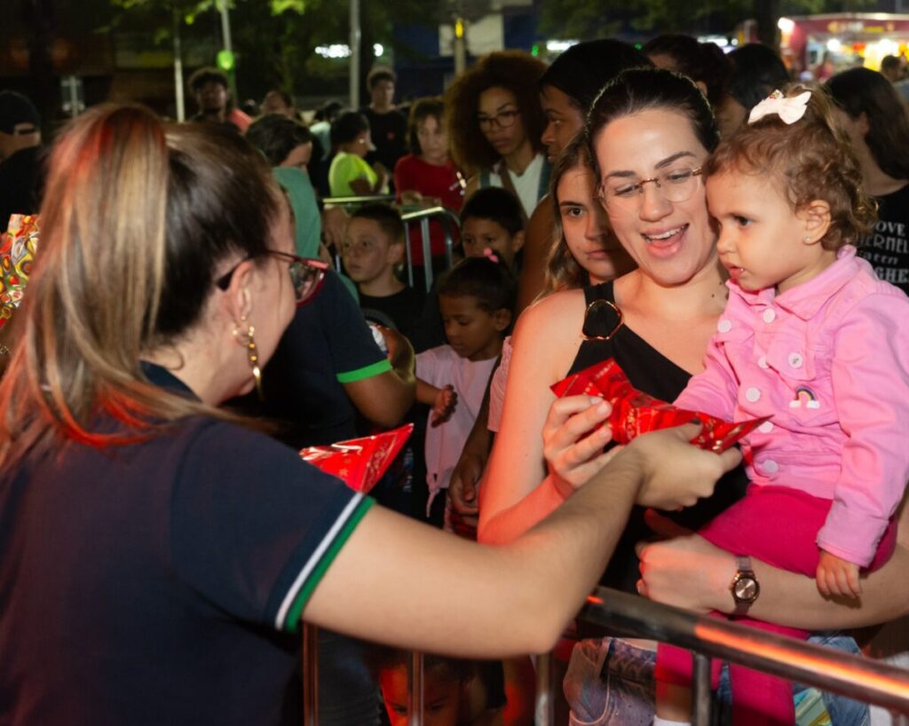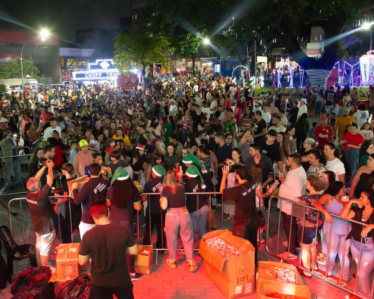Na chegada à Praça, uma multidão aguardava pela tradicional distribuição gratuita de brinquedos, promovida pela Dacalda. A ação social garantiu um Natal mais alegre para centenas de famílias que participaram da celebração.
