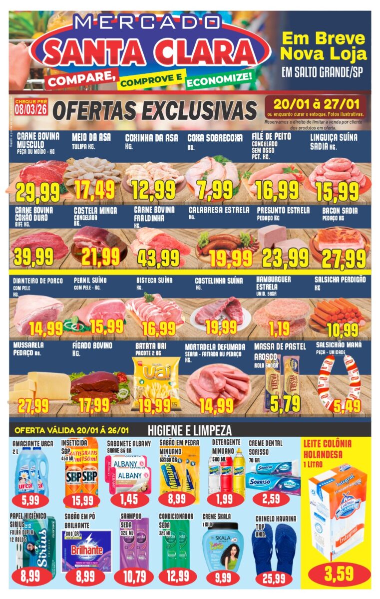 A relação é uma lista de produtos em promoção do encarte de ofertas do Mercado Santa Clara, um supermercado que divulga folhetos físicos e digitais com preços especiais por período determinado (27/12 a 31/12).